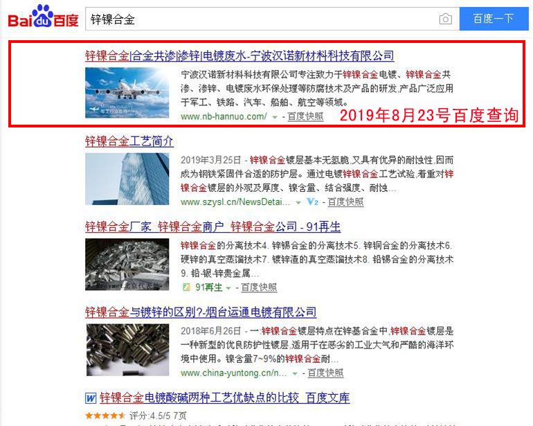 鋅鎳合金 百度(PC)自然排名第1名